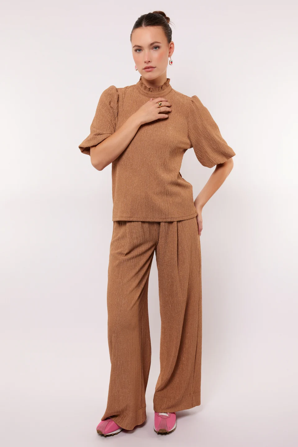 De AUKE BROEK is jouw nieuwe everyday essential met flair. Dankzij de stretchy tailleband en rechte pijpen zit deze broek altijd goed. De speelse structuur in de stof geeft net dat beetje extra aan een verder clean silhouet. Draag met een top in dezelfde stof of style los met een blazer.