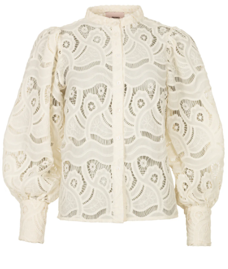 Een luchtige off-white blouse gemaakt van crochet geweven stof met elegante wijde mouwen.