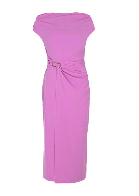 Deze jurk is gemaakt van een crepe jersey kwaliteit met stretch, waardoor hij soepel om het lichaam valt en de hele dag comfortabel draagt. De asymmetrische schouderlijn geeft het ontwerp een verfijnde, modieuze twist, terwijl de goudkleurige buckle in de taille een chic accent vormt en het silhouet prachtig accentueert.