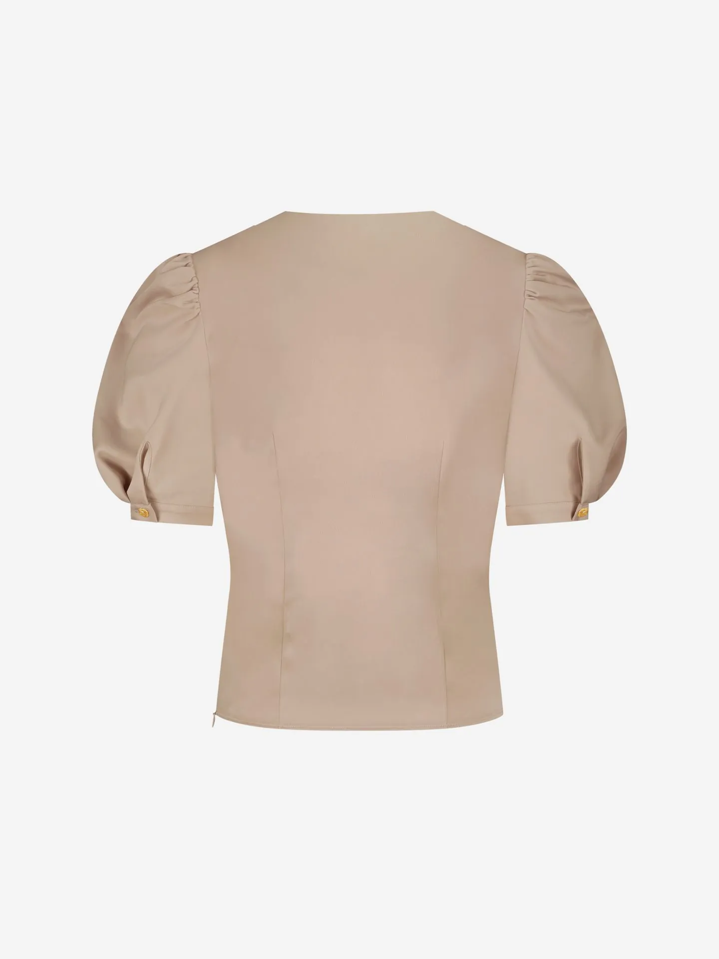 Korte satijnen blouse met subtiele pofmouwen en een elegante watervalhals die overloopt in een V-hals. De top is voorzien van een ritssluiting en heeft een normale pasvorm.
