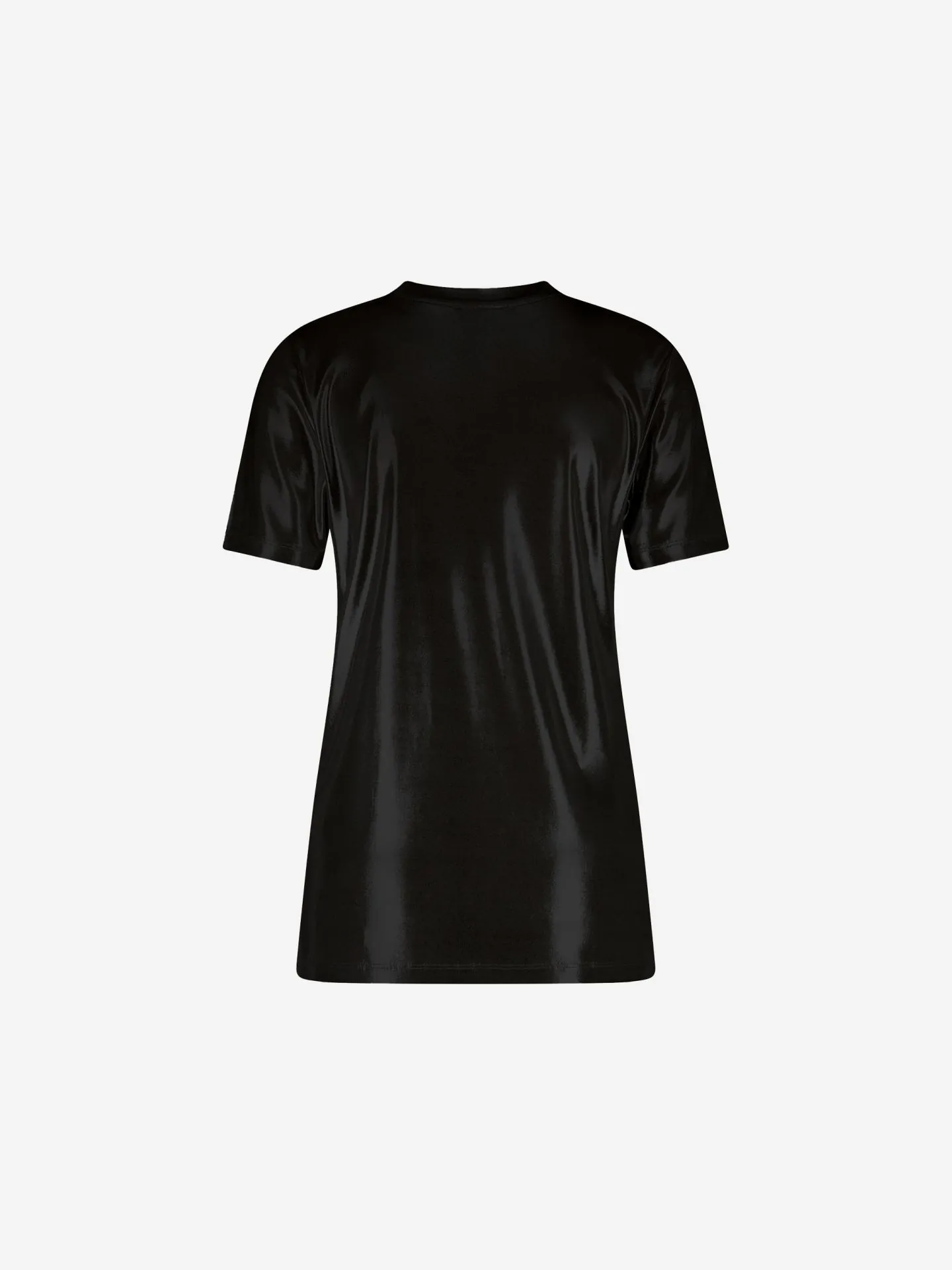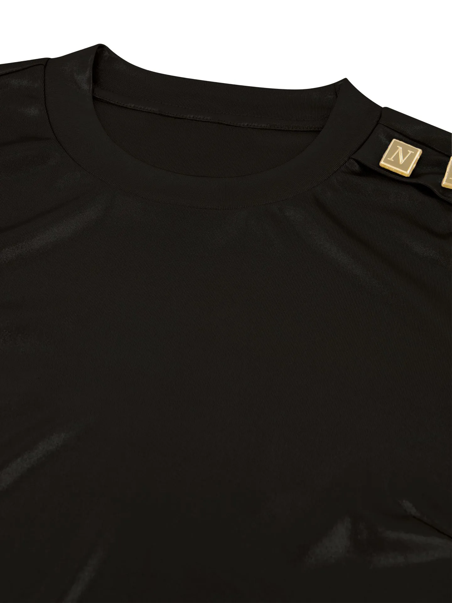 ProductomschrijvingMetallic look T-shirt met een ronde hals, decoratieve knopen op de schouder en een normale pasvorm.