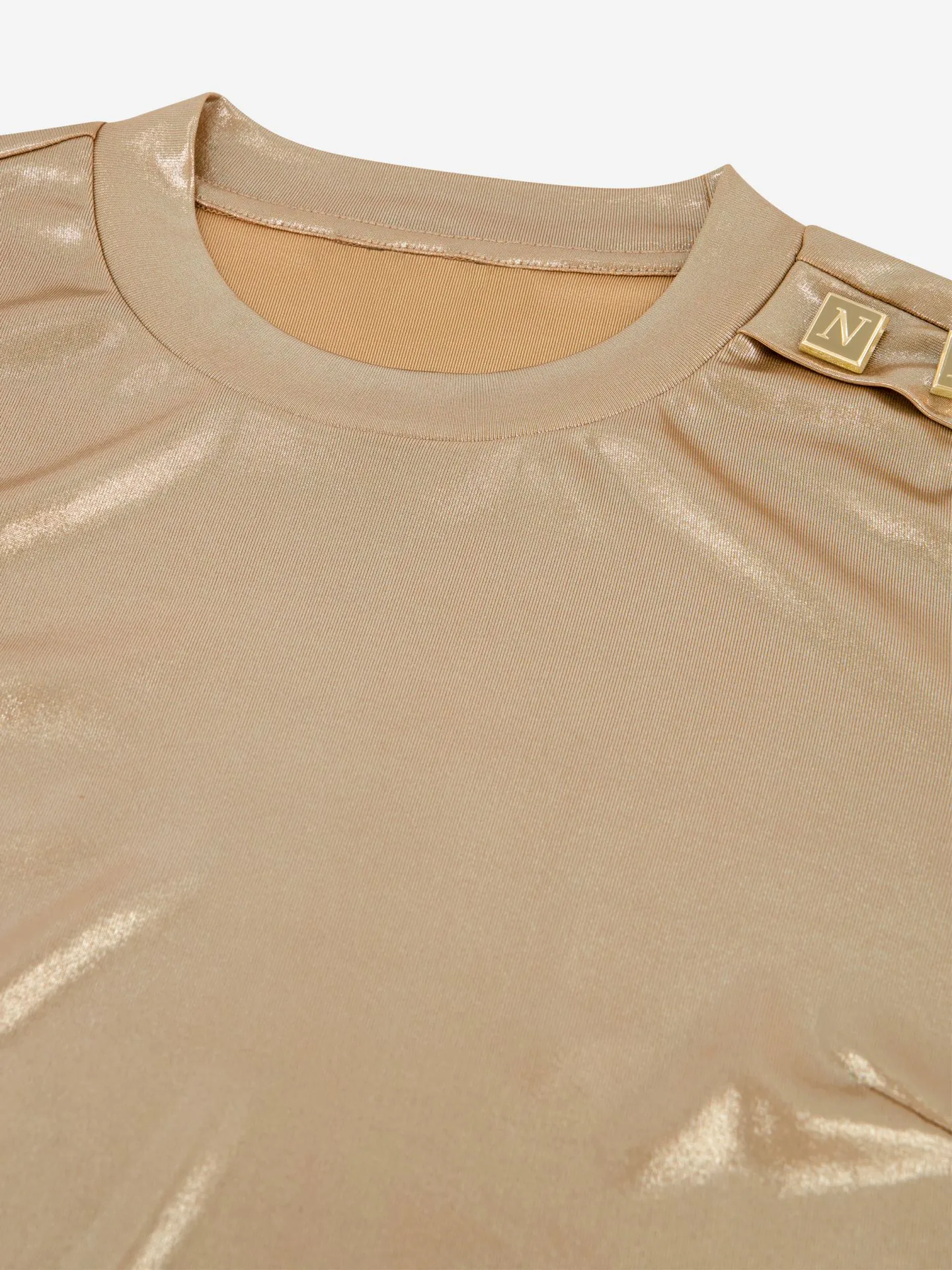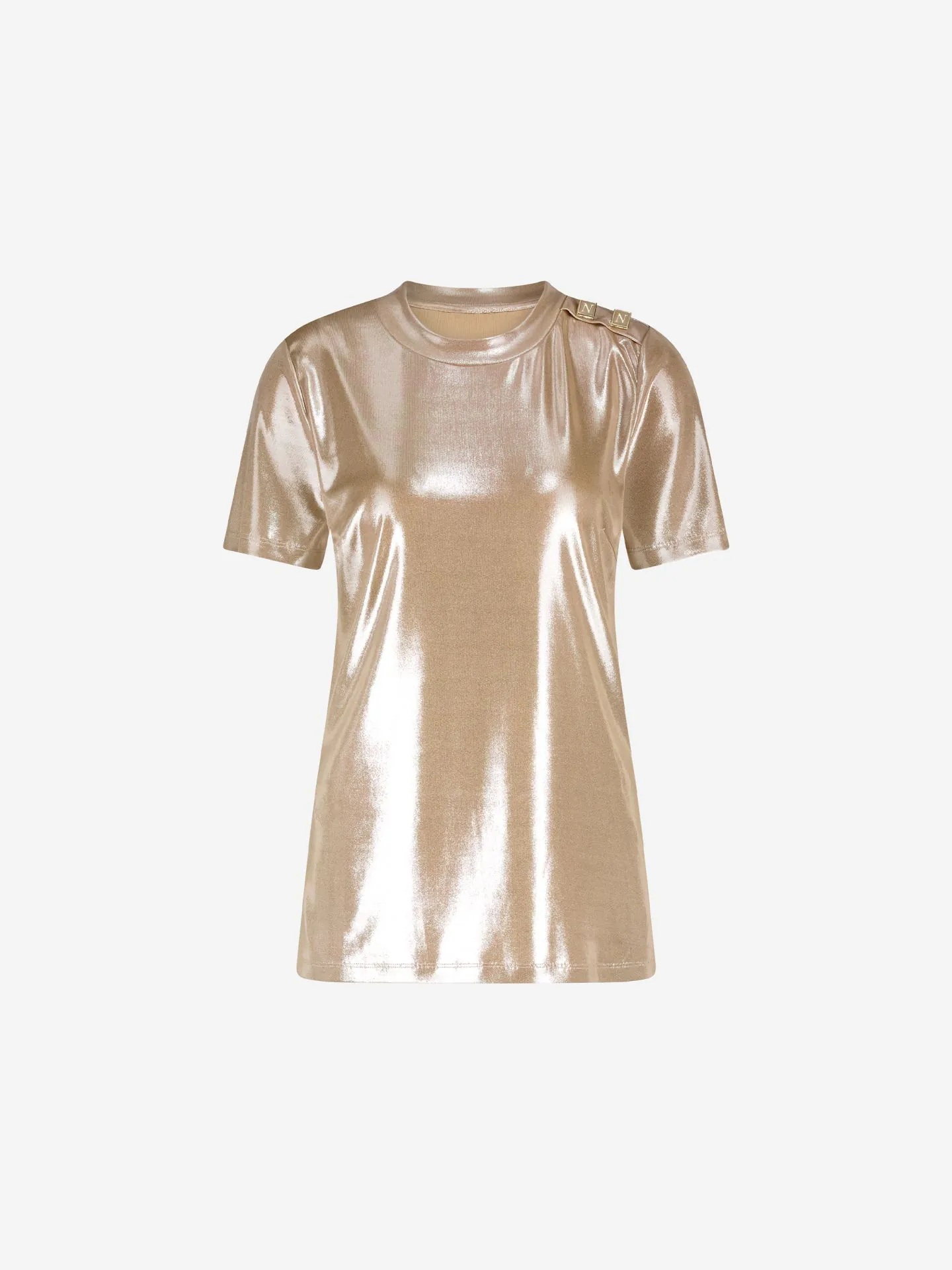 Metallic look T-shirt met een ronde hals, decoratieve knopen op de schouder en een normale pasvorm.