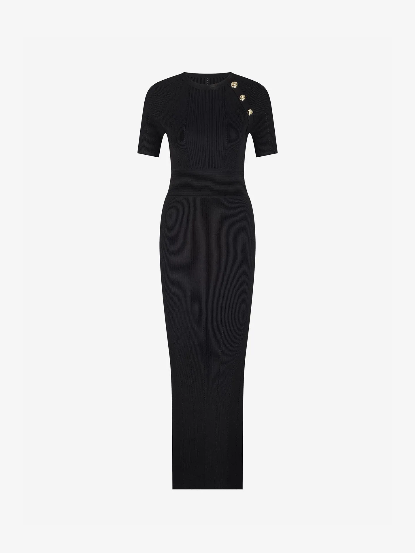 Gebreide maxi jurk met een verticale ribstructuur, een ronde hals en knoopdetails. De jurk is voorzien van korte mouwen en een normale pasvorm.