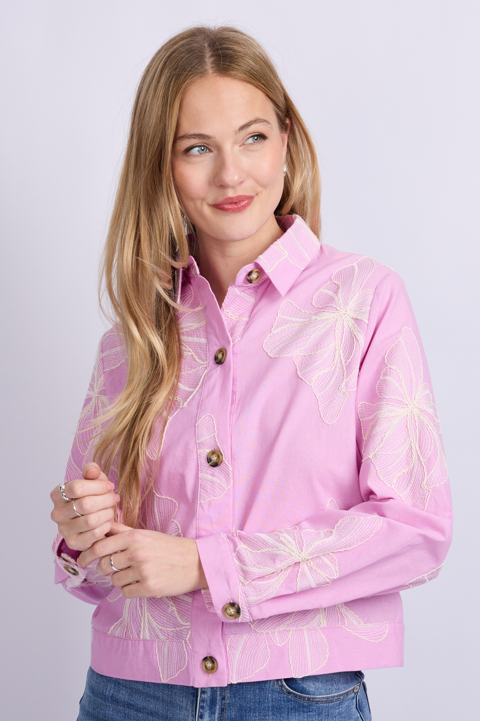 De Lunae blouse is een elegante toevoeging aan je garderobe, met een subtiel geborduurd bloemenpatroon dat luxe en verfijning uitstraalt. De glanzende knoopsluiting en het zachte materiaal geven de blouse een chique uitstraling, terwijl de ontspannen pasvorm zorgt voor een moeiteloze look. Perfect te dragen als blouse of open als jasje.