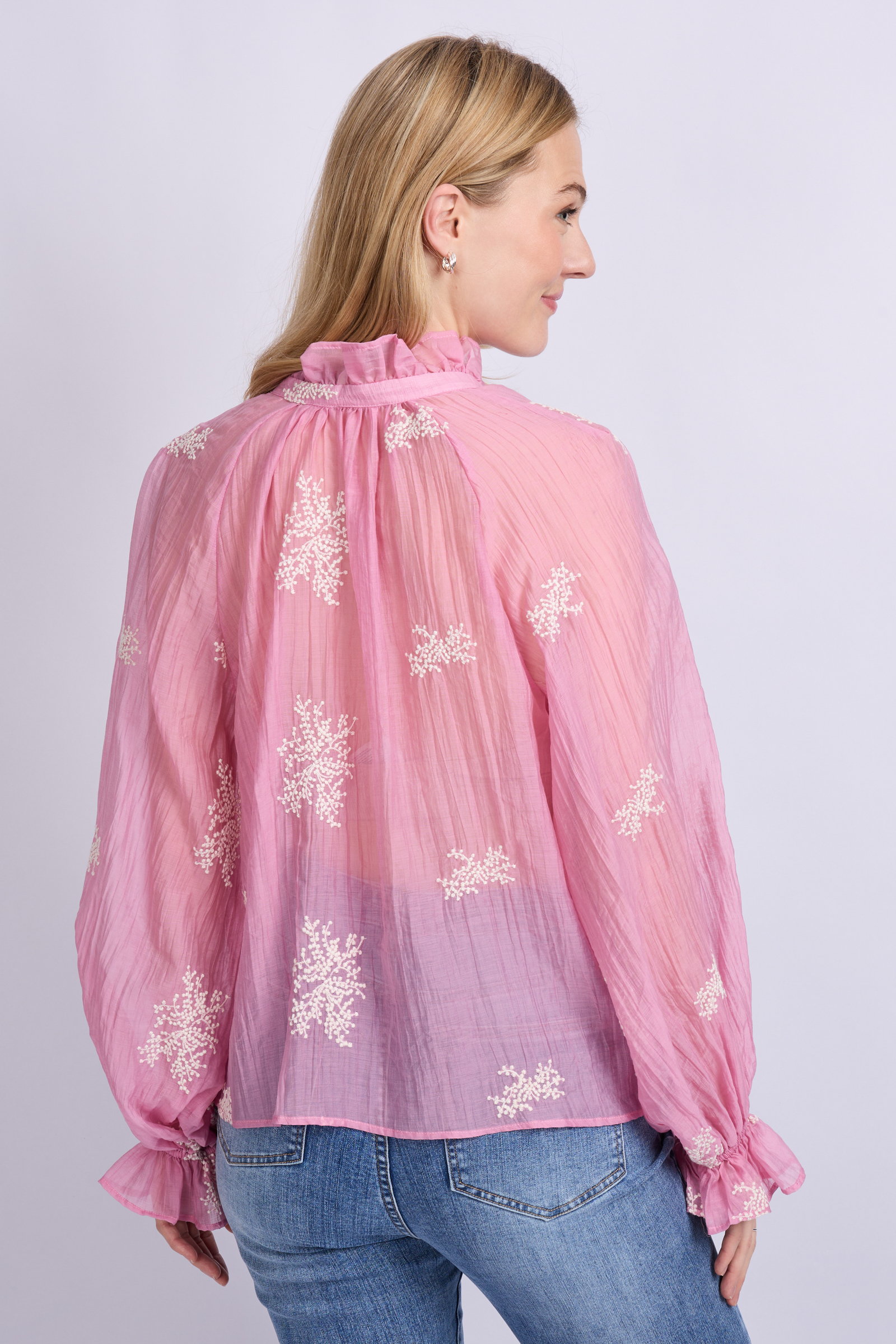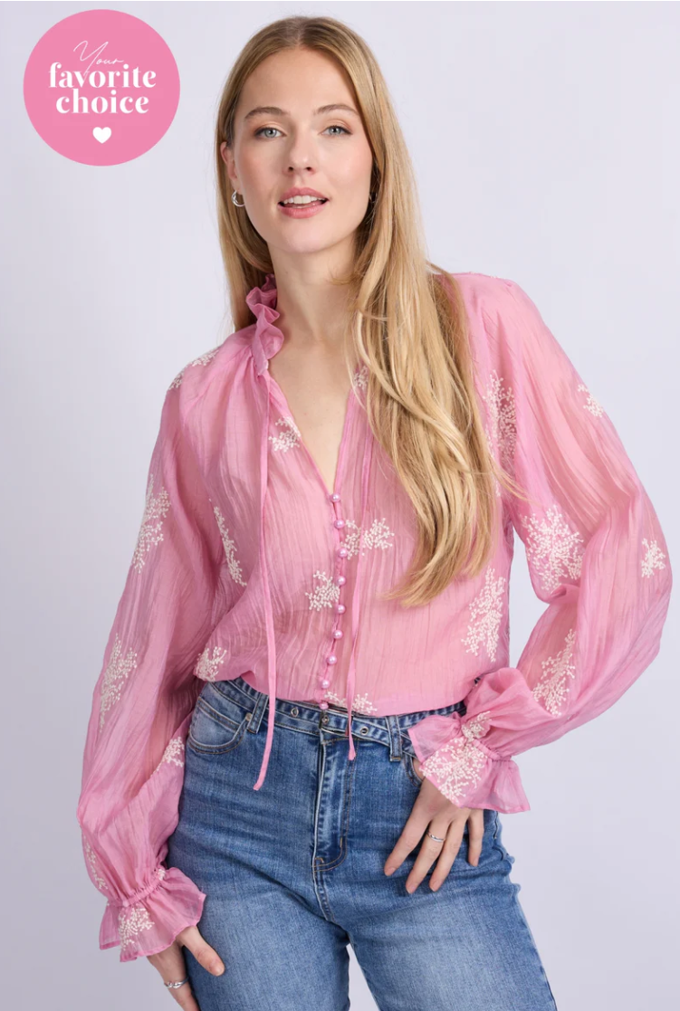 De Lyra blouse is een verfijnde blikvanger met een romantische twist. Het semi-transparante materiaal en het subtiele borduursel creëren een luchtige, vrouwelijke uitstraling. De opstaande kraag met strikdetail en de licht geplooide mouwen met rucherand geven het ontwerp een charmante, elegante touch. Perfect te combineren met een pantalon of denim voor een stijlvolle, tijdloze look.