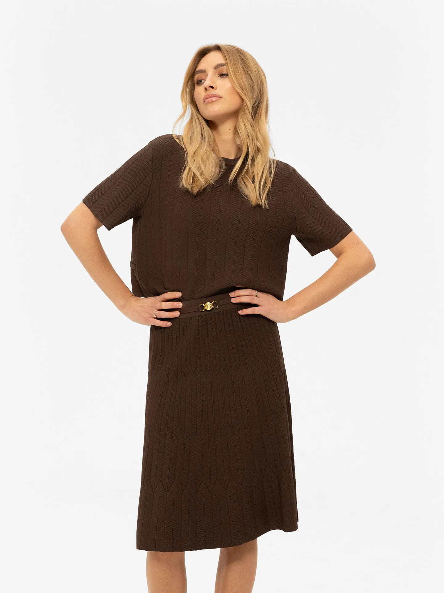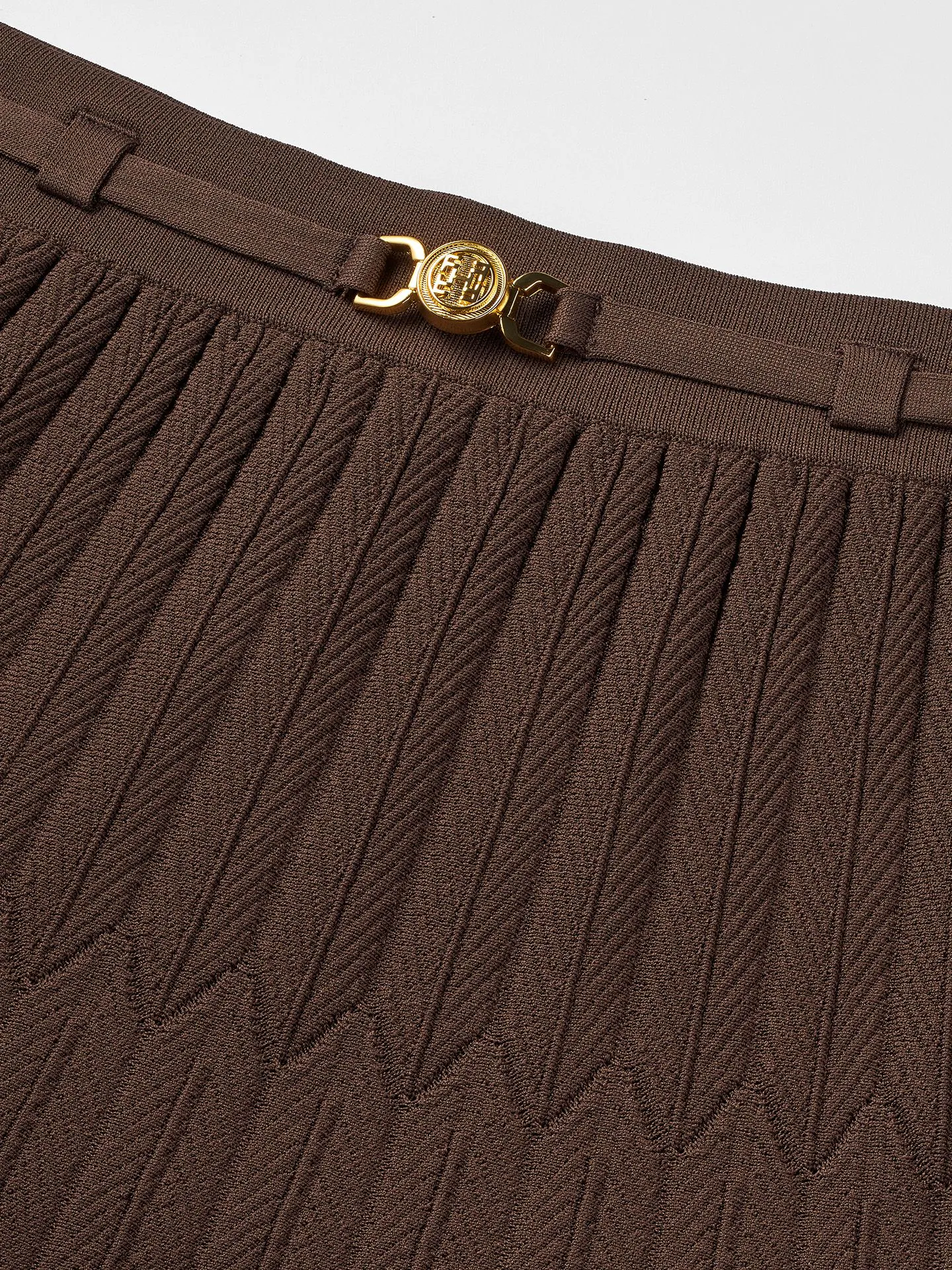 A-lijn rok met een subtiele structuur, een smalle riem met logo gesp en geplooid effect. De rok is voorzien van een elastische tailleband.