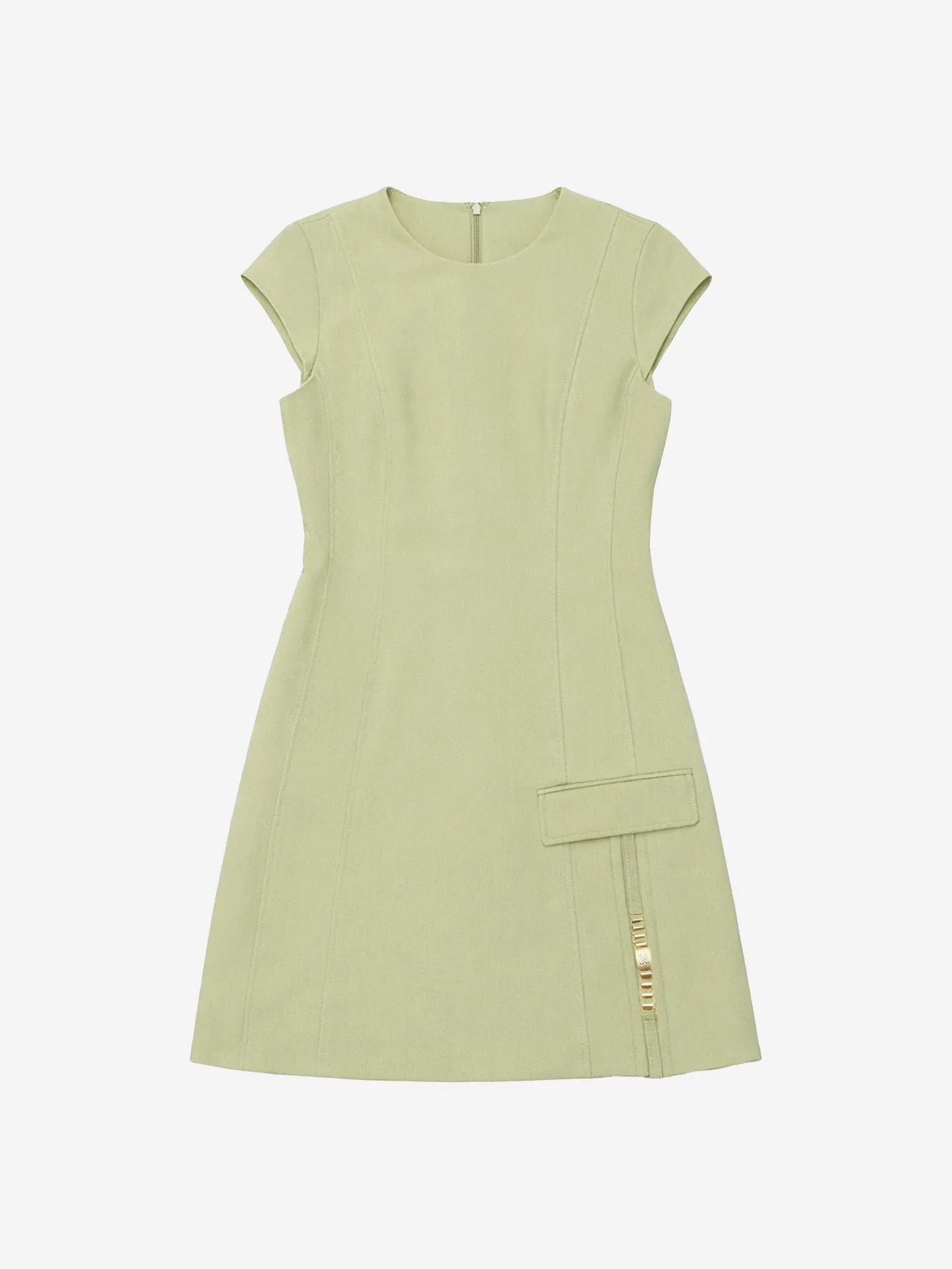 ProductomschrijvingAansluitende jurk met kapmouwtjes, een ronde hals en een decoratieve klepzak met ketting detail. De jurk heeft een ritssluiting op de rug.