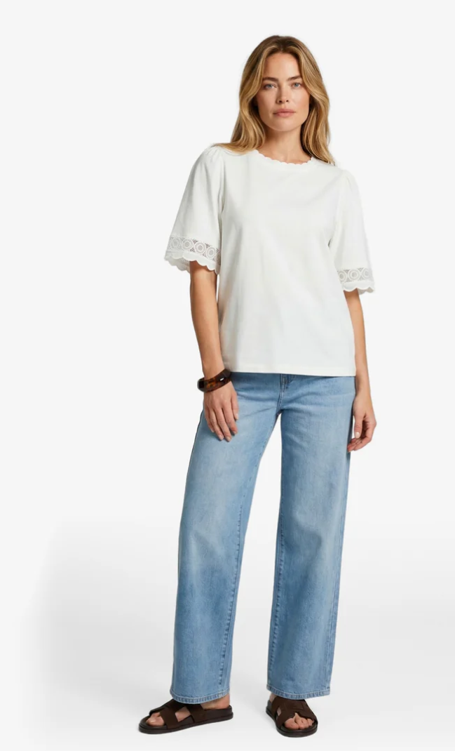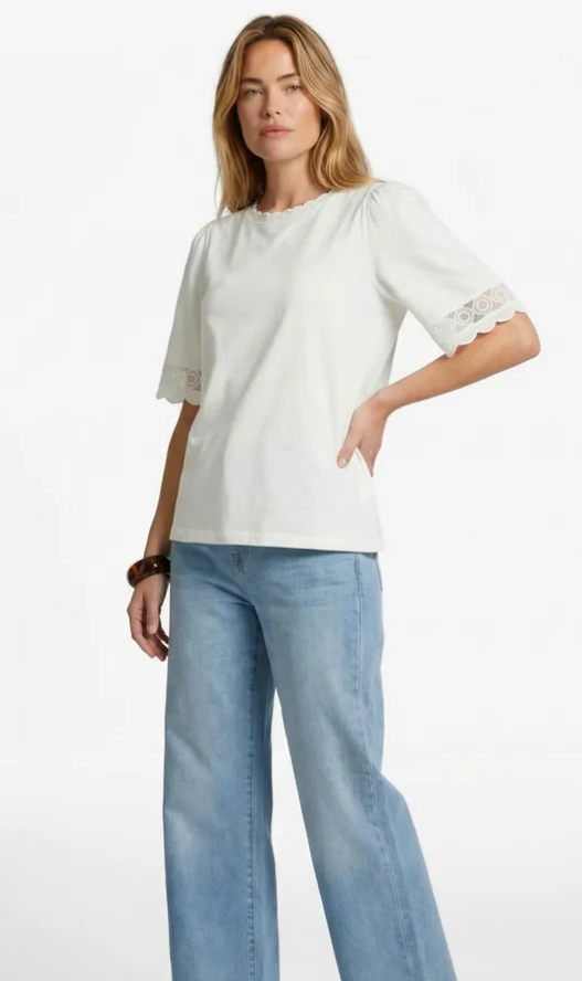De Thessa top is een verfijnde basic met een zachte en vrouwelijke uitstraling. Het model heeft een ronde hals en halflange mouwen met een subtiele kanten afwerking, wat zorgt voor een elegante en speelse touch. De soepele stof draagt comfortabel en geeft de top een mooie, rustige fit. Perfect te combineren met een jeans of pantalon voor een moeiteloos verzorgde en stijlvolle look.