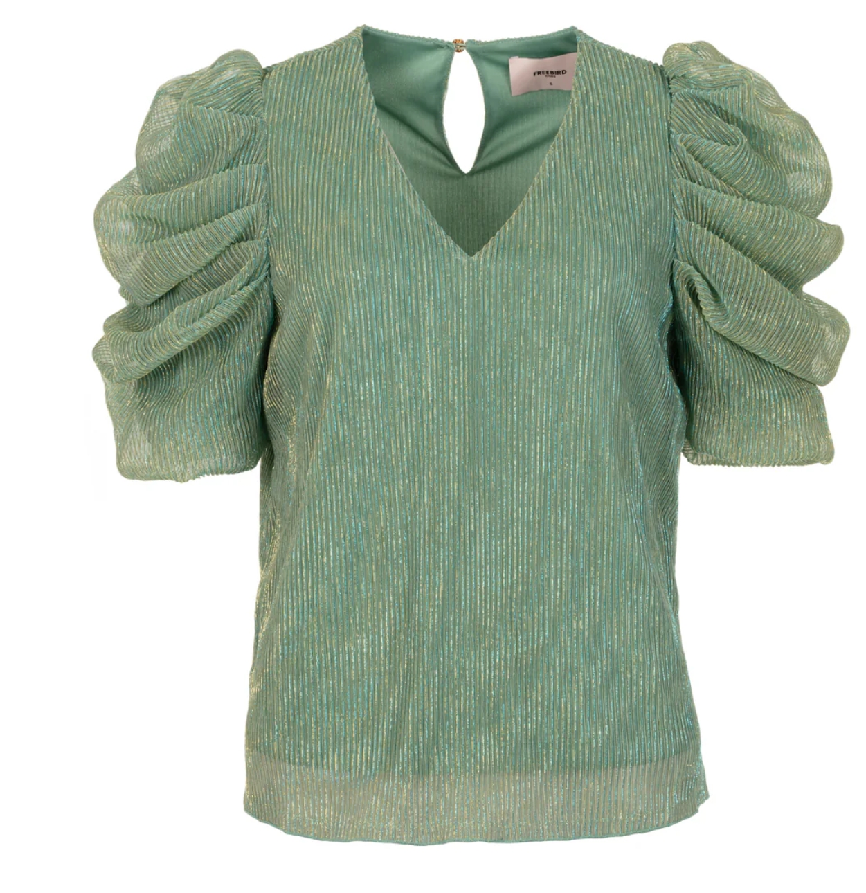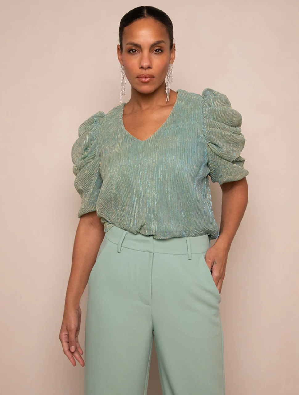 Voeg een opvallende touch toe aan je garderobe met deze unieke top in glinsterend jadegroen.