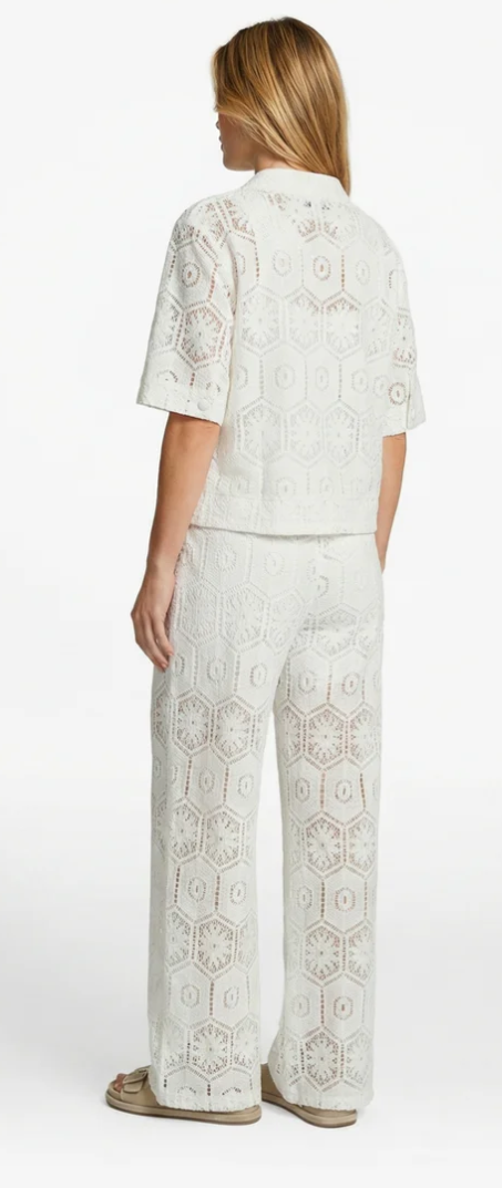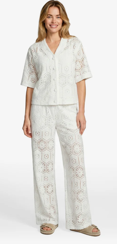 De Tola blouse is een luchtige blouse met een verfijnde en zomerse uitstraling. Het model heeft een klassieke kraag, een knoopsluiting en korte mouwen, wat zorgt voor een tijdloze en comfortabele fit. Het opengewerkte patroon geeft de blouse een elegante en speelse touch, terwijl de lichte stof mooi luchtig draagt. Perfect te combineren met een bijpassende Perina broek.